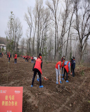 植樹現場,黨旗、志愿者旗幟隨風飄揚,志愿者們積極分工協作、干勁十足,在技術人員指導下,認真做好挖坑、栽植、培土、澆水等工作,各個環節銜接有序、配合默契。經過大家近2個小時的努力,共栽植冬青樹苗近百棵。志愿者以實際行動踐行了“綠水青山就是金山銀山”的發展理念,倡導了人人參與綠化行動,弘揚生態文明新風尚。大家還為栽種好的樹苗掛上了供銷社的牌子。